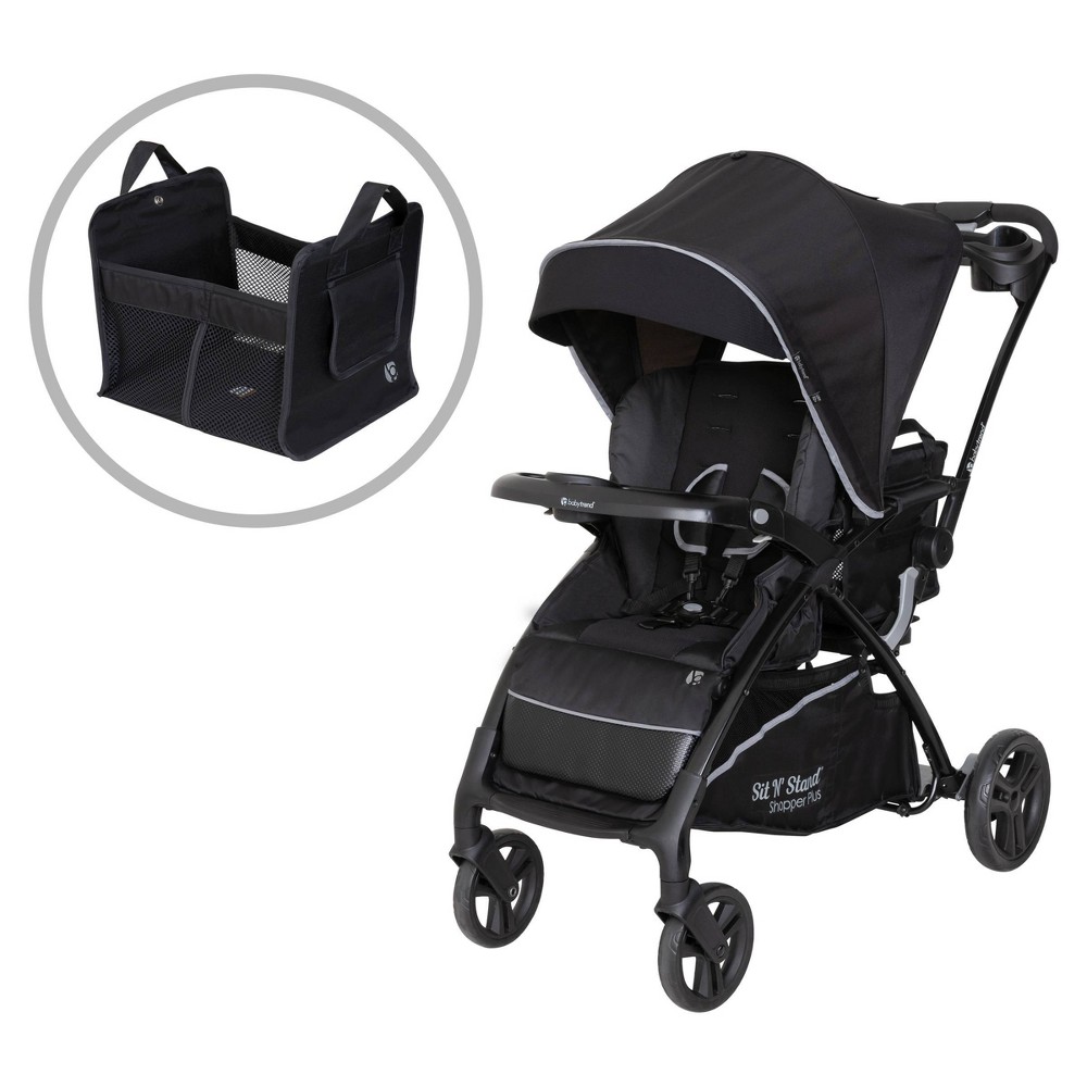 The Baby Trend Sit N’ Stand 5-in-1 Shopper Plus Stroller is perfect for your growing family. With the new compact and streamlined frame, our Sit N’ Stand 5-in-1 Shopper Stroller has 5 modes of use – car seat travel system mode, car seat in the front seat with sibling on platform, child in the stroller seat only, child in the stroller seat with sibling sitting on bench, and child in the stroller seat with sibling standing. The front and back seats can hold kids up to 50lbs each.Sit N' Stand 5-in-1 Shopper Plus offers ultimate storage solutions with its included Bench Tote and MagneTec™ Basket. The Bench Tote can be easily attached to the Shopper’s bench for extra storage, or it can be used separately as a shopping tote! Designed with mesh siding, easy-grip handle and perfect size, it holds 20lbs of your strolling necessities or groceries. With the innovative MagneTec™ Basket, parents can open and close the basket very quickly with the help of strong magnets to hold the basket closed. This practical extra-large basket and tote together can hold up to 50lbs of parents’ essentials – groceries, toys, diaper bags, etc.Strolling with our Sit N’ Stand Shopper Stroller will be a breeze with your little ones. Your children will appreciate Comfort Cabin, which includes a removable extra-long canopy with UPF 50+ protection, multi-position reclining seat, deluxe fabrics and premium padding that will keep them safe and comfy, staying away from the harmful sun rays. Parents will love our Parent Premiums that include a modern parent console with multi-directional cell phone positioner and extra-deep cup holders. Plus, mom and dad now can easily access the large storage basket from the front or back!