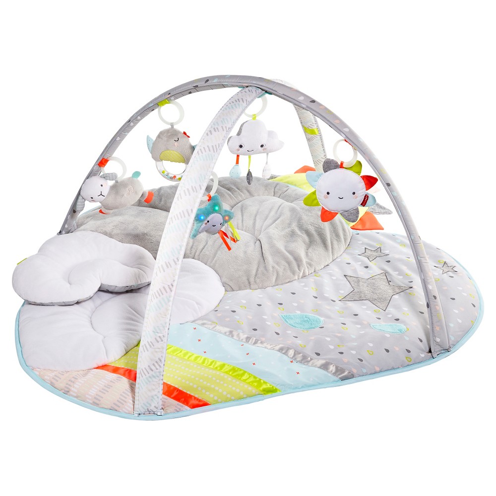 Every cloud has a silver lining and this dreamy baby activity gym is no exception! Offering hours of plush playtime, it features a soft color palette to complement modern decor along with pops of bright colors to stimulate baby's sight. Five celestial-themed hanging toys will engage baby with lights, music and other stimuli while the cushy mat offers ultimate, cloud-like comfort. When it comes to baby's enjoyment, the sky's the limit!