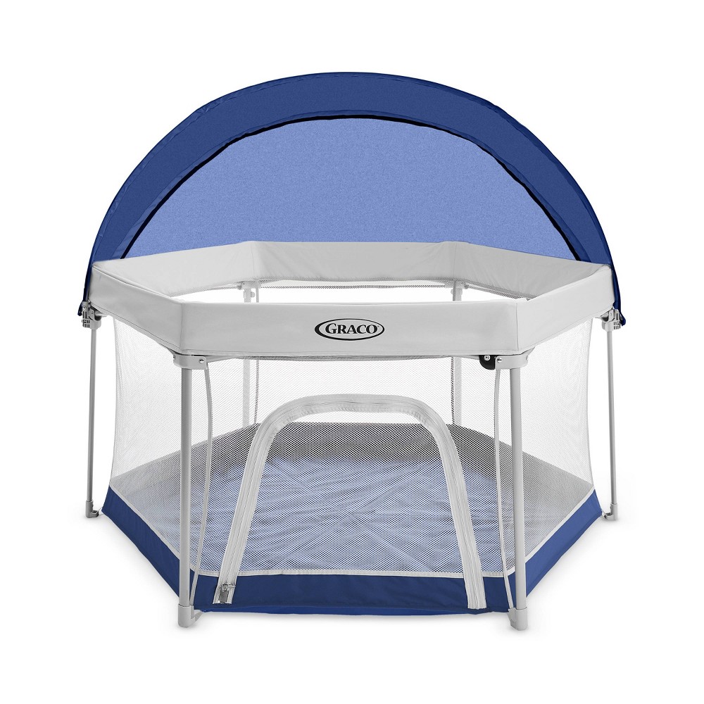 For indoor or outdoor use, the Graco Pack 'n Play Lite Traveler™ LX Playard folds up compactly for easy travel and storage. The LiteTraveler is the most compact folding outdoor playard* (*vs. the leading competitor), featuring a one-step setup and fold for easy use. This extra-large playard can be used like a baby gate to create a spacious play area for your living room or a roomy and safe outdoor play space for your backyard or deck. A removable UV 50 canopy provides sun protection and shade for outdoor play. Airy mesh sides help keep your child in sight as they play, while a zippered activity door allows for easy in and out. A padded floor provides added comfort. It features durable, removable fabrics that are machine washable for easy cleaning. Includes a travel bag with shoulder strap for on-the-go convenience.