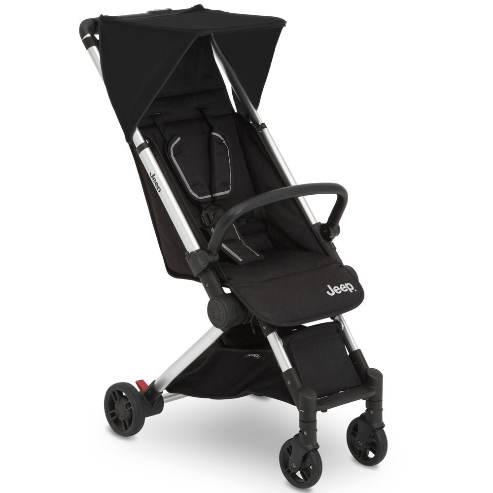 Designed for the family on the move, the Jeep Arrow Travel Stroller by Delta Children is extremely lightweight and ultra-compact when folded. Whether you're exploring the local scenery or traveling overseas, the arrow is the ideal choice-it easily fits in any plane or train overhead bin, or your car's trunk. Plus, the stroller's one-handed fold is the easiest ever! The included travel bag ensures your stroller stays in perfect shape during voyages or while stowed away at home. A convenient storage basket under the frame keeps all your travel essentials within reach. Expertly designed with high-end materials, this stroller features a lightweight, aluminum frame, knit canopy, faux leather child bar and reflective Pipping that makes taking nighttime walks safe. Its all wheel suspension, one-step footbrake and swivel-front wheels guarantee a smooth, stable ride on almost any terrain. Since 1941, the Jeep brand has been a symbol of freedom and expression. Influenced by a love of the great outdoors, Jeep kids products are created for little adventurers. Color: Jet Black.