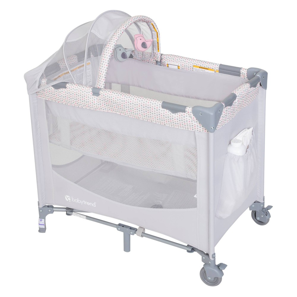 Baby Trend Mini : Easy and convenient for travel and storage! The Baby Trend Mini Nursery Center Playard is perfectly sized for your bedroom. With its nimble frame and included travel bag, the Mini Nursery Center is perfect for the family on-the-go. Little ones will love the ratcheting canopy with two toys to promote visual stimulation as well as grasping and reaching skills. Diaper time is a breeze with the storage pocket on the side for changing essentials and even baby’s toys. As your baby grows, the Mini Nursery Center transforms into the ideal playtime center and the large caster wheels with brakes provide added mobility and stability. Color: Daisy Drop. Pattern: Solid.