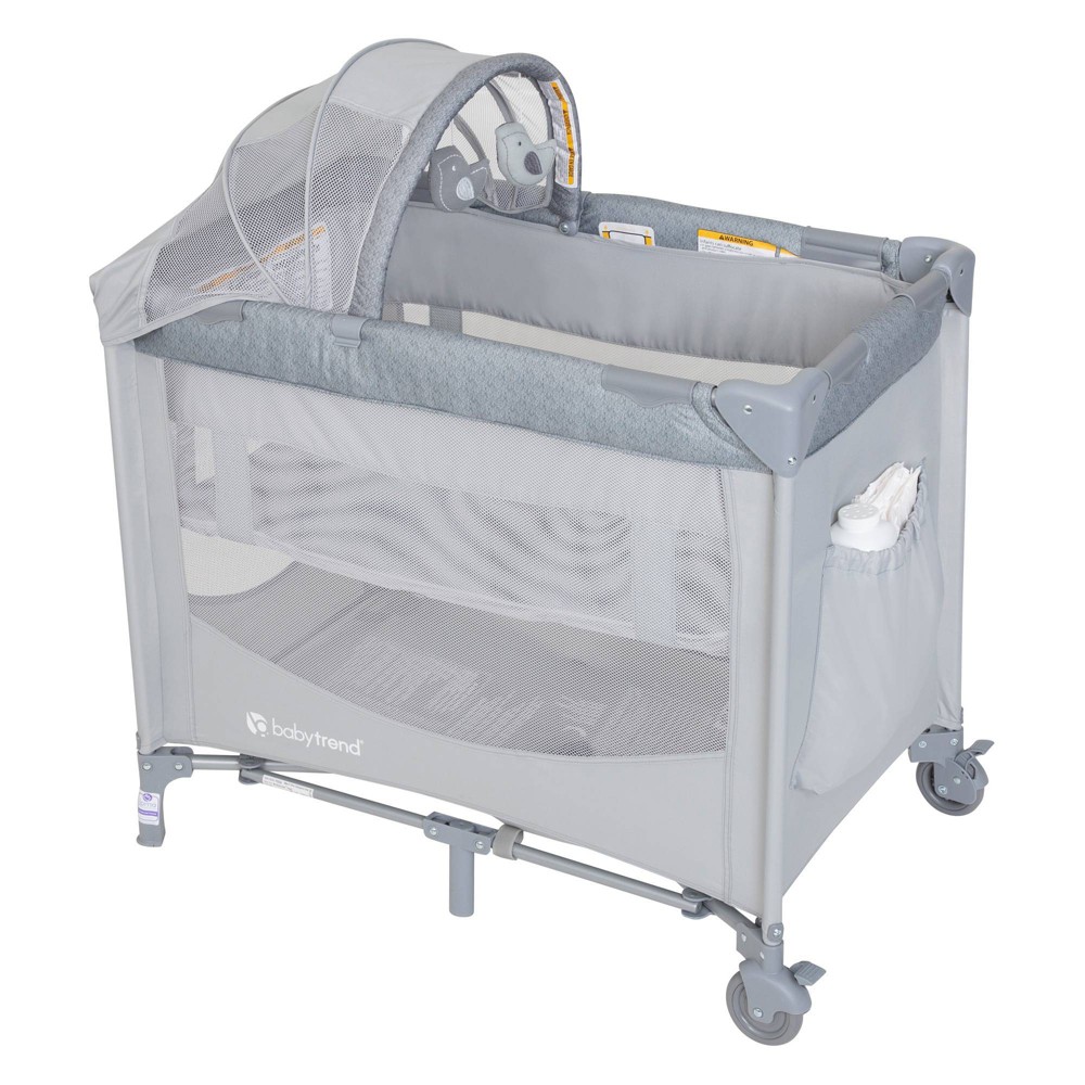 Baby Trend Mini Nursery Center Playard - : Easy and convenient for travel and storage! The Baby Trend Mini Nursery Center Playard is perfectly sized for your bedroom. With its nimble frame and included travel bag, the Mini Nursery Center is perfect for the family on-the-go. Little ones will love the ratcheting canopy with two toys to promote visual stimulation as well as grasping and reaching skills. Diaper time is a breeze with the storage pocket on the side for changing essentials and even baby’s toys. As your baby grows, the Mini Nursery Center transforms into the ideal playtime center and the large caster wheels with brakes provide added mobility and stability. Color: Glenview. Pattern: Solid.
