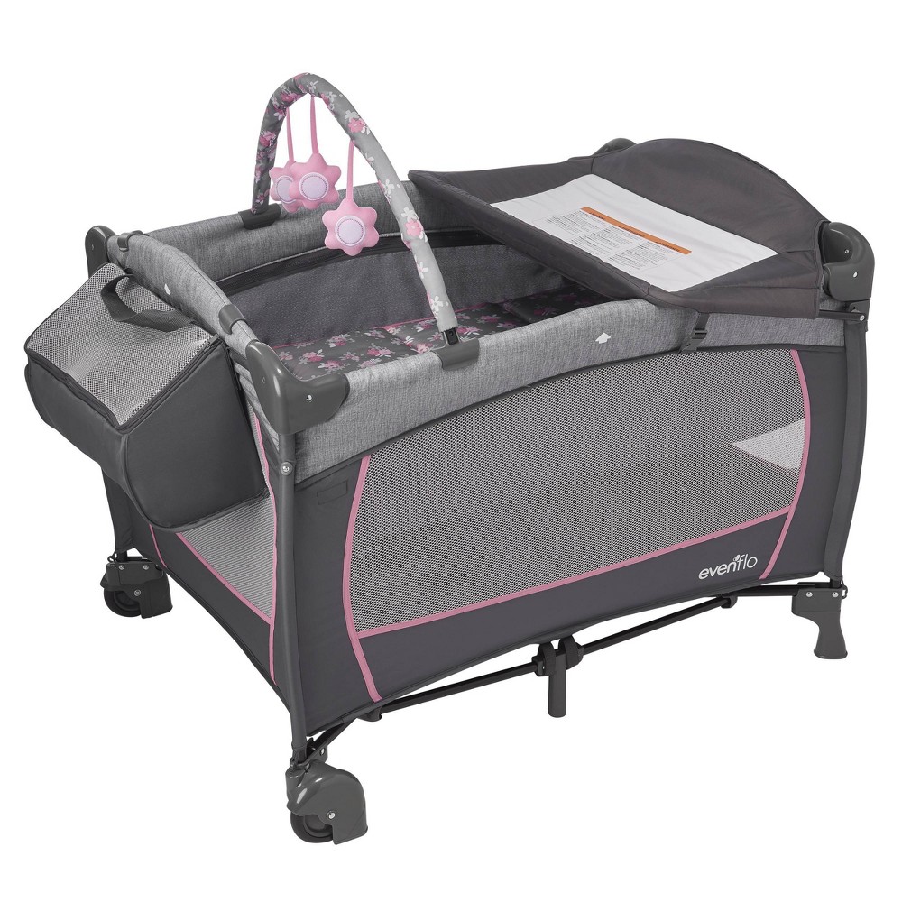 Baby will be living the suite life with the Evenflo Portable BabySuite DLX Playard. This playard is more than just that with multipurpose features like a flip-away diaper changer to maximize space when not in use. A full-size bassinet includes a toy bar with plush toys making it perfect for playtime or nap time. Place the bassinet mat on the floor and use with the toy bar to create a clean, safe tummy-time space. The removable storage organizer offers multiple options to store baby’s essentials, and attaches to the playard railing or to the carry bag when off to grandma’s house. Plus, it’s easy to setup and take down. Versatile and portable – this playard has it all! Color: Poppy.