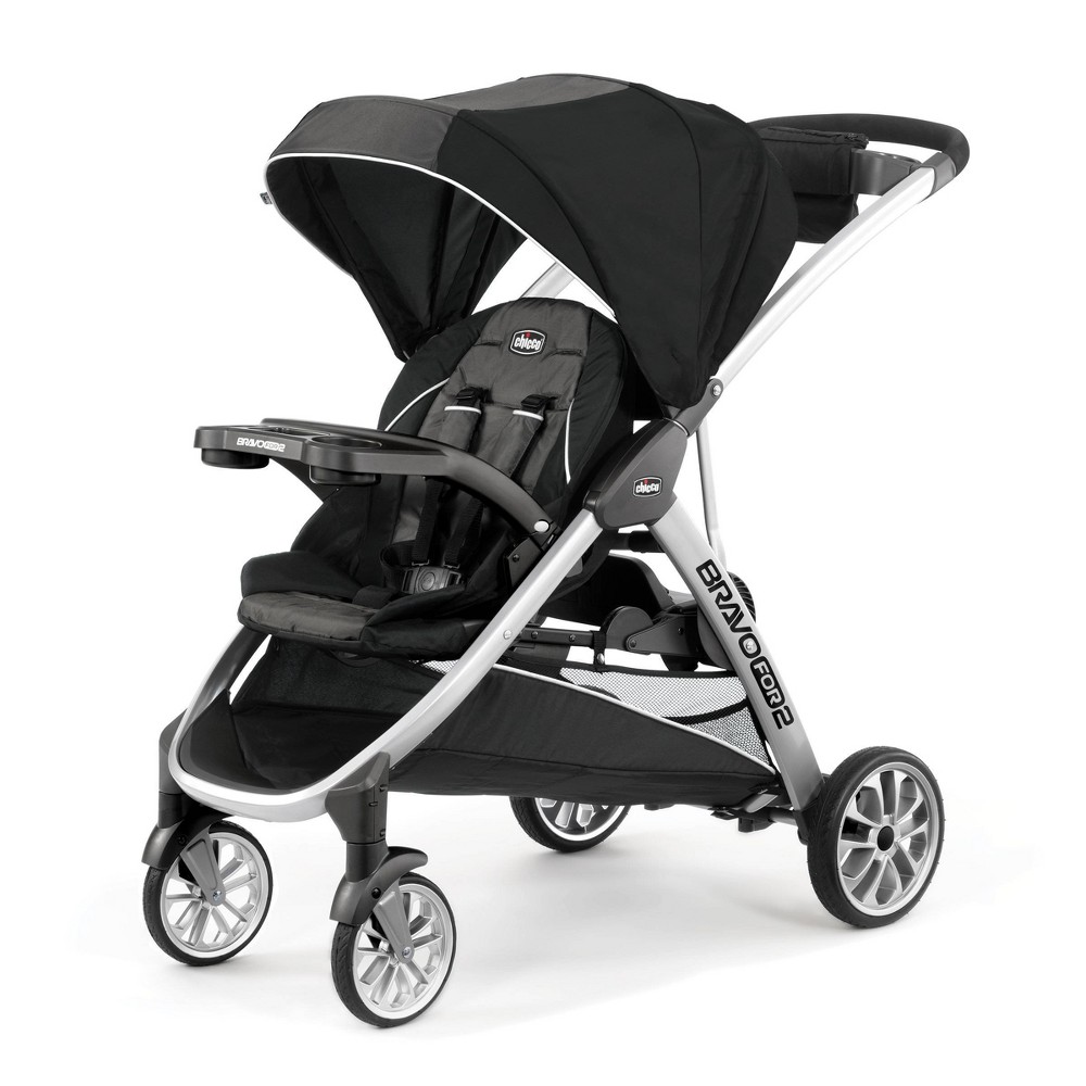 For younger children, the Chicco BravoFor2 Standing/Sitting Double Stroller features a traditional padded stroller seat, five-point harness, large adjustable canopy, and removable tray with two cup holders. For infants, the stroller seat folds forward to accept any Chicco infant car seat with easy click-in attachment (car seat sold separately). For older siblings, the BravoFor2 is outfitted with a bonus back seat and platform where big kids can choose to sit or stand. The seat folds away easily when unoccupied and includes a three-point harness for security. Easy-grip handles provide added stability for standing and a backrest gives extra support. The BravoFor2 is designed with a one-hand, ultra-compact quick fold for easier maneuvering and storage. An integrated handle easily activates the fold and simultaneously rotates the front wheels inward to keep the folded unit standing. Once the stroller is closed, the fold handle also doubles as a carry handle. Treaded rubber tires, full suspension, and front swivels help maintain a smooth ride for both passengers in every configuration. One-touch brakes keep the stroller in place when parked. A padded push-handle, parent tray with two cup holders, and large storage basket with front and rear access provide added convenience for mom or dad.