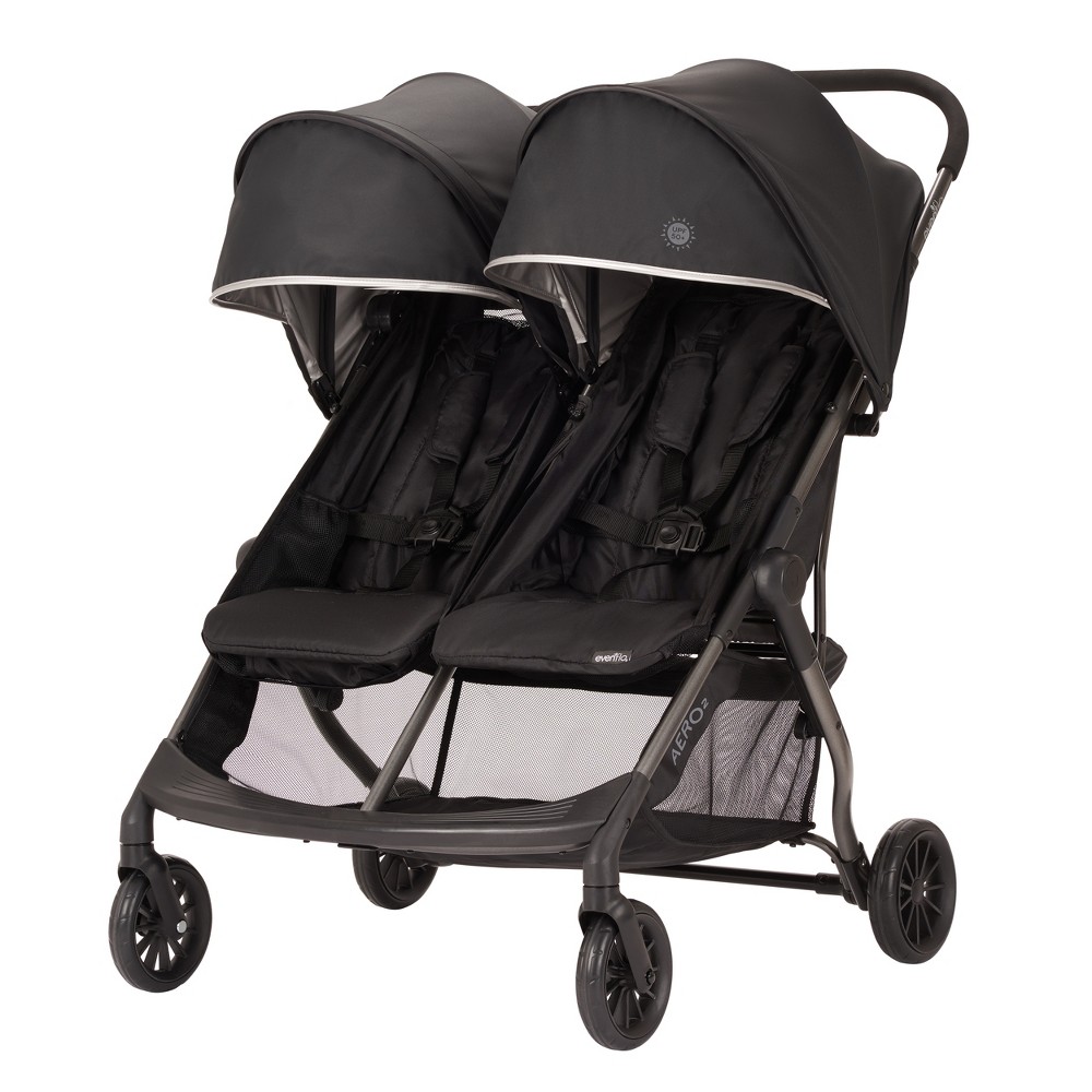Offering functionality and portability, the Evenflo Aero² Ultra-Lightweight Double Stroller features a unique shopping basket to maximize storage options when riding with one child. This additional basket can be attached to the front of either seat, and stores under the seat when not in use. The Aero²’s quick and compact fold fits into smaller spaces - simply lift the in-seat handles for a quick and easy fold. The folded stroller conveniently self stands to simplify getting it in and out of your vehicle. Additional storage options include 2 seatback storage pockets perfect for phones or wallets, and an extra-large storage basket with front and rear access. Each child also has their own mesh pocket on the side of their seat, with a child-friendly elastic opening, perfect for keeping snacks and toys within reach. Large canopies with flip-out visors and UPF 50+ sun protection help shield your babies from the sun’s harmful UV rays. Easily navigate with one-hand steering and use the rear-wheel locks to steady the stroller when getting children in and out. Individually reclining seats provide customized comfort - one child can sit up to explore the world while the other relaxes. The thoughtfully designed flex-hold cup holder provides a snug fit or a variety of beverage sizes to prevent spills. Under 30” wide and weighing under 23 lbs, the Aero² fits through standard doorways, and combines a lightweight frame with extended storage, perfect for your family’s active lifestyle. Color: Lark.